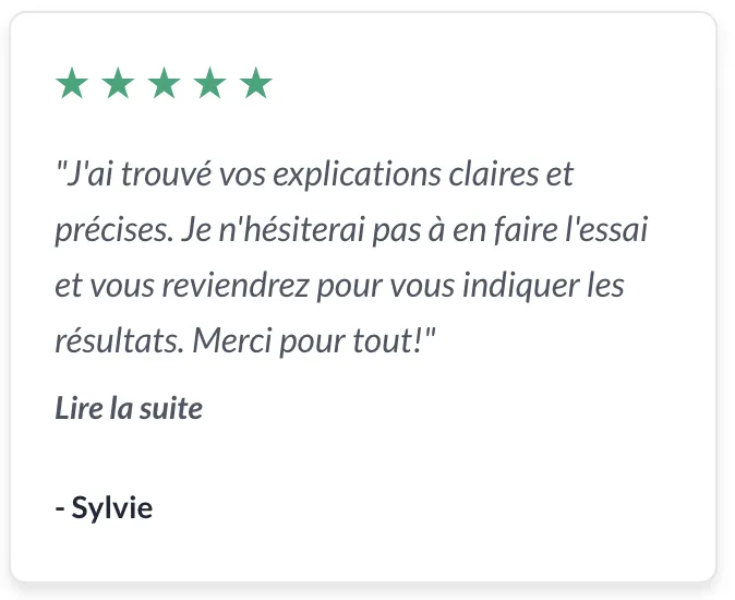 "J'ai trouvé vos explications claires et précises. Je n'hésiterai pas à en faire l'essai et vous reviendrez pour vous indiquer les résultats. Merci pour tout!"